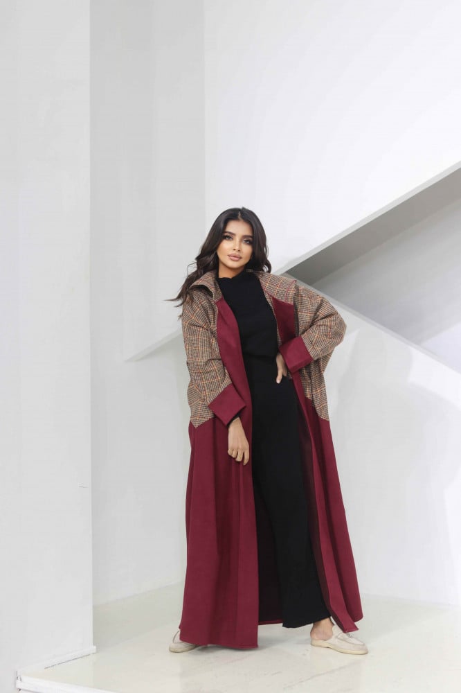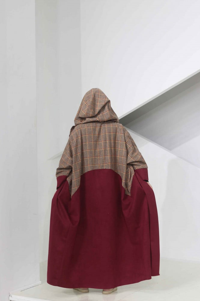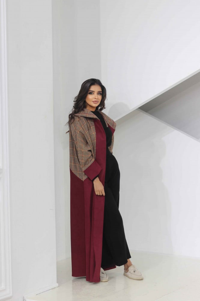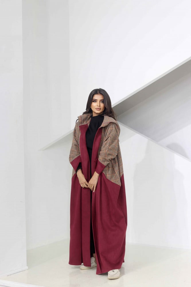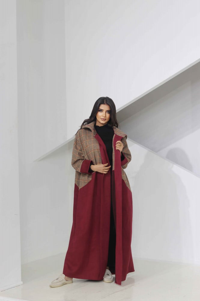 فروة شتوية بنمط كاروهات مميزة وفخمة وبقبعه لدفء اكثر من خامة جوخ كاروهات مع شامواه من افضل الخامات الدافئة و العملية، صمم بقبعه و بكاروهات بتدرجات بيج وعنابي من الأعلى وبلون عنابي ساده من الأسفل ومن الجوانب بقصة مثلث.