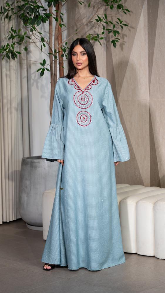 جلابية بلون سماوي مطرزة بأحمر ناعم