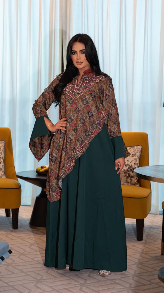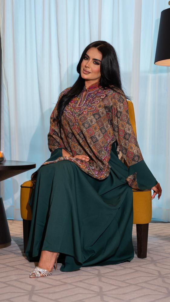 - تداخل خامة هندي بطبعات ألوان مع الجزء السفلي زيتي غامق
