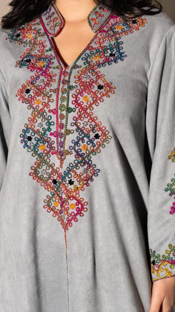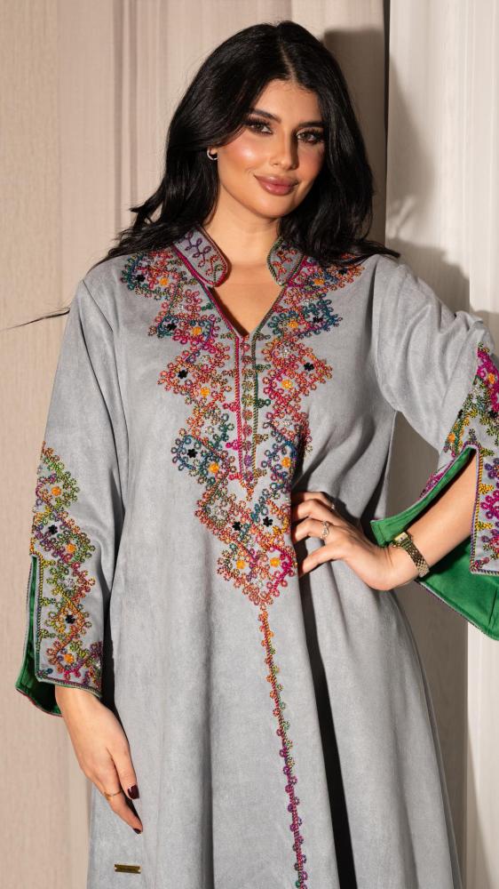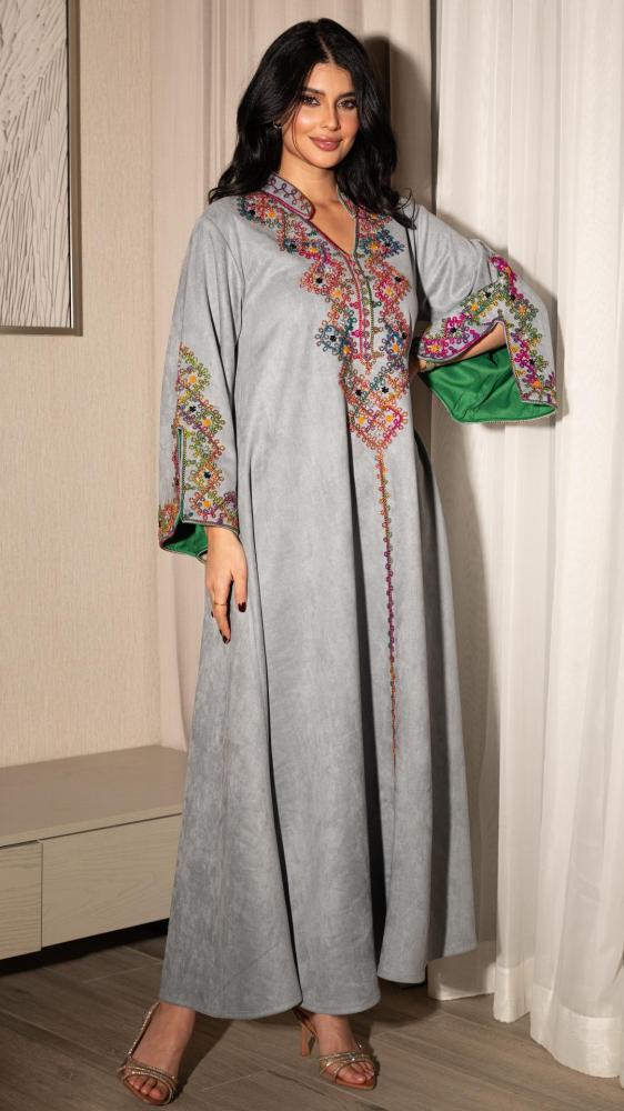لاتترددين في أختيارها جلابية شتوية بلون رمادي مبطنة بأخضر مطرزة بتداخلات الوان دافئة على الصدر وعلى الاكمام والاكمام مصممة بفتحة ناعمة زادت من فخامتها اخترنا لها خامة ( شامواه الصدر مطرز بخيط حرير كشميري ملون مع شك يدوي ) من افضل الخامات الشتوية