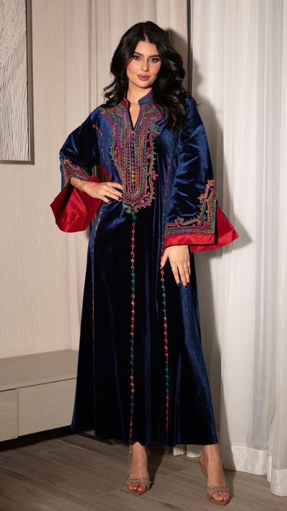 جلابية شتوية بلون كحلي غامق مع تطريز ألوان على الصدر والأكمام