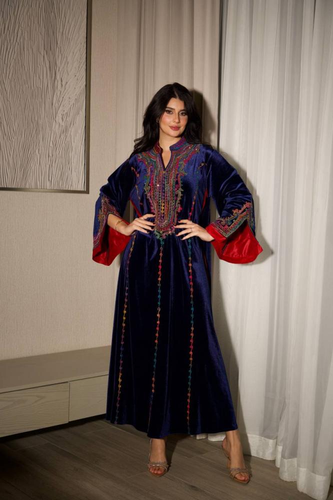 مصممة بياقة عالية وبتطريز بألوان متناسقة على الصدر والاكمام