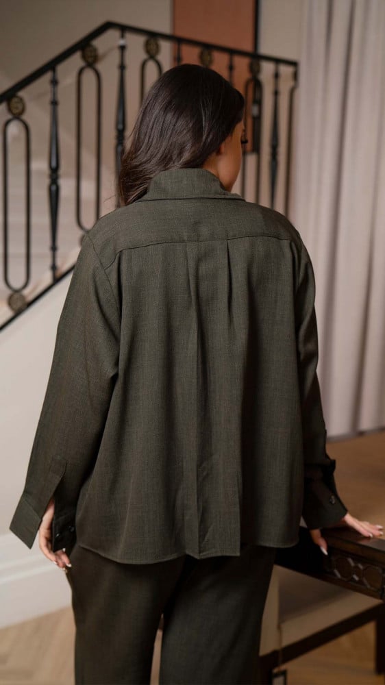 طقم قميص وبنطلون زيتي مميز بتصميمه الأنيق ويلائم مختلف أوقاتك للدوام أو الطلعات مع الأصدقاء.