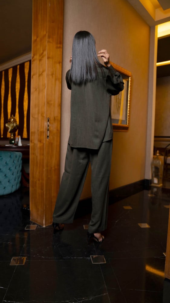 - الموديل: طقم قميص وبنطلون زيتي مميز.