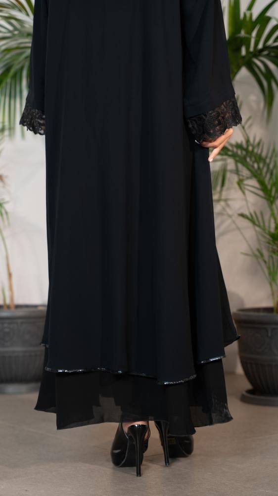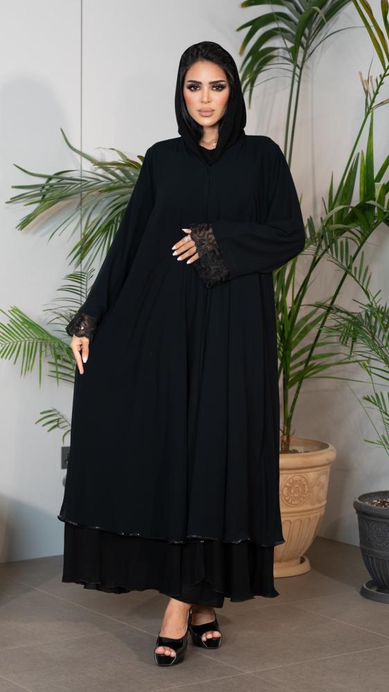 عباية باكمام دانتيل والاسفل طبقتين مزين بترتر