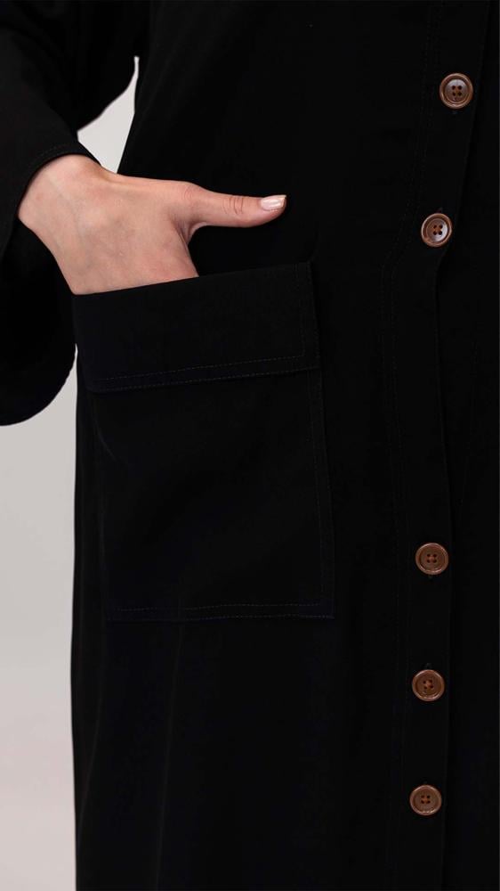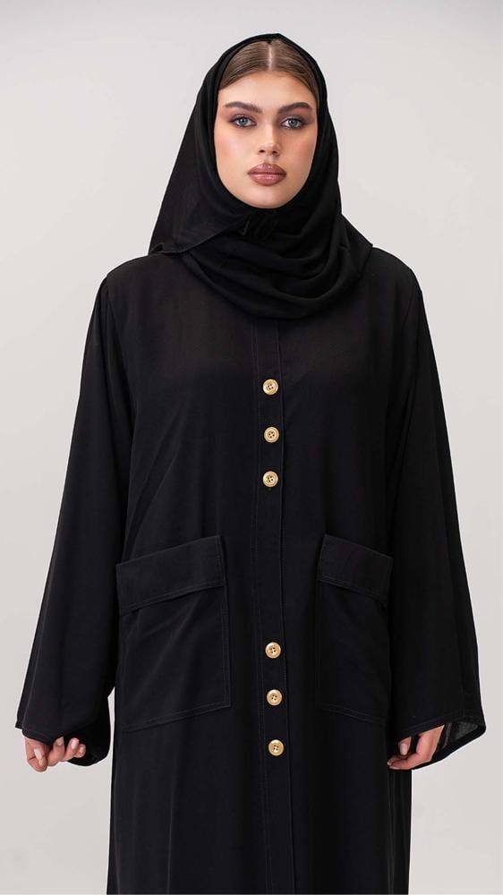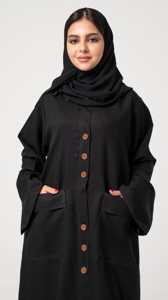 - الموديل: عباية بجيوب وأزرة بني بتصميم عملي ومريح