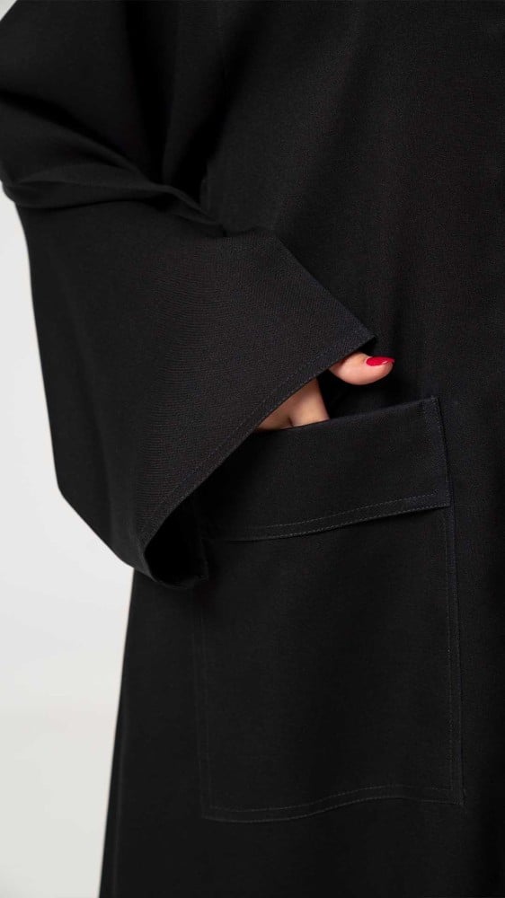 استلهمنا الألوان من ثقافتنا المحلية وفكرنا ليش ما نصمم عباية راقية وأنيقة وفيها تفاصيل تشبهنا 😍! ولأنك تحبين البساطة الملكية اخترنا تكون قصة العباية عادية وهادية ✨.. وجمالها كله في لونها وسوادها الفاحم وخامتها الملكية وعشان نعطيها لمسة رقي أضفنا أزارير باللون البني غيّرت في العباية كثير 🤎!