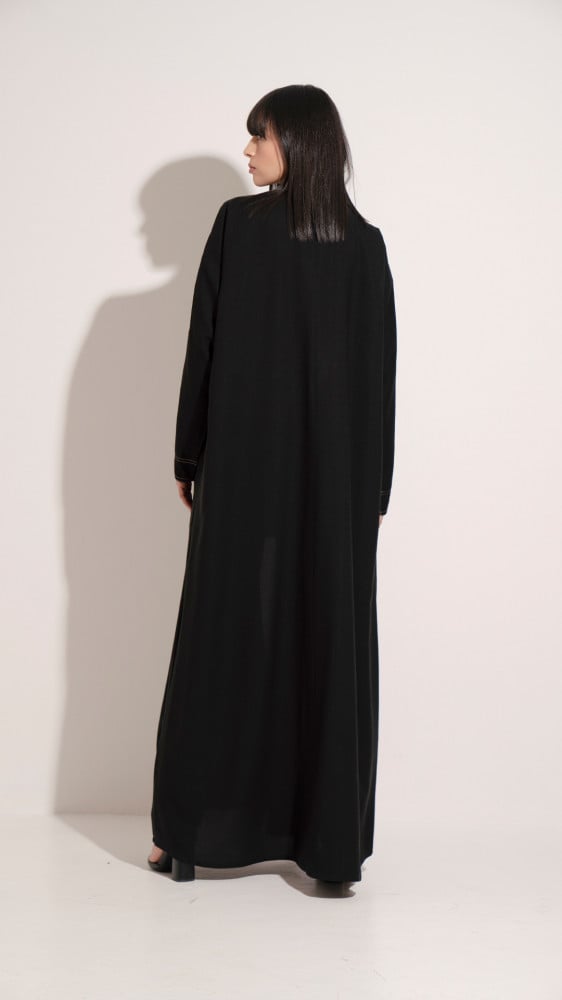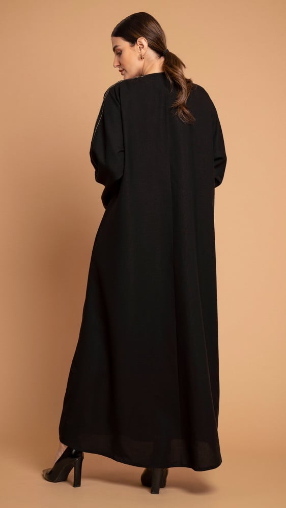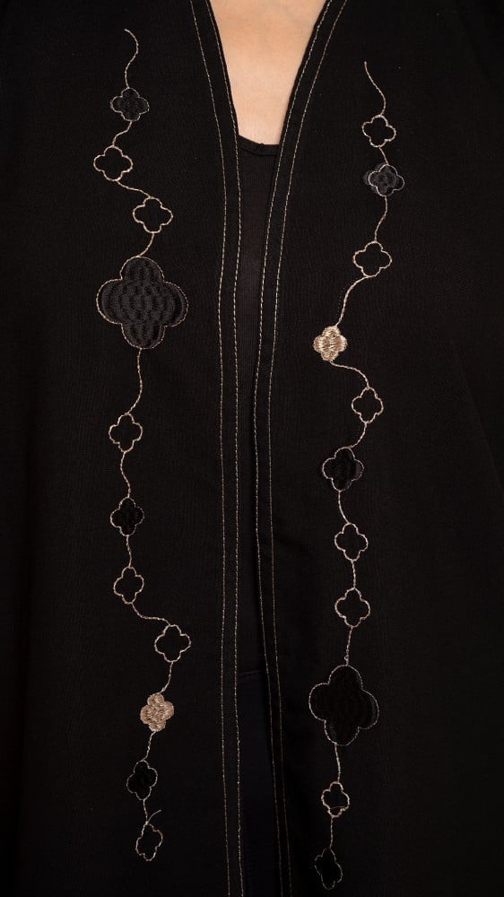 العباية بموديل عملي وخامه تتحمل اللبس اليومي، من خامة ميني ميت العملية، تم تصميمها مفتوحه بتطريز ذهبي ناعم من الصدر وحول الاكمام خياطه ذهبي ناعمه مناسبه للعمل والمشاوير اليوميه.