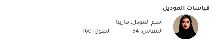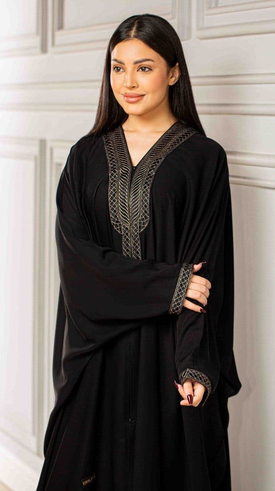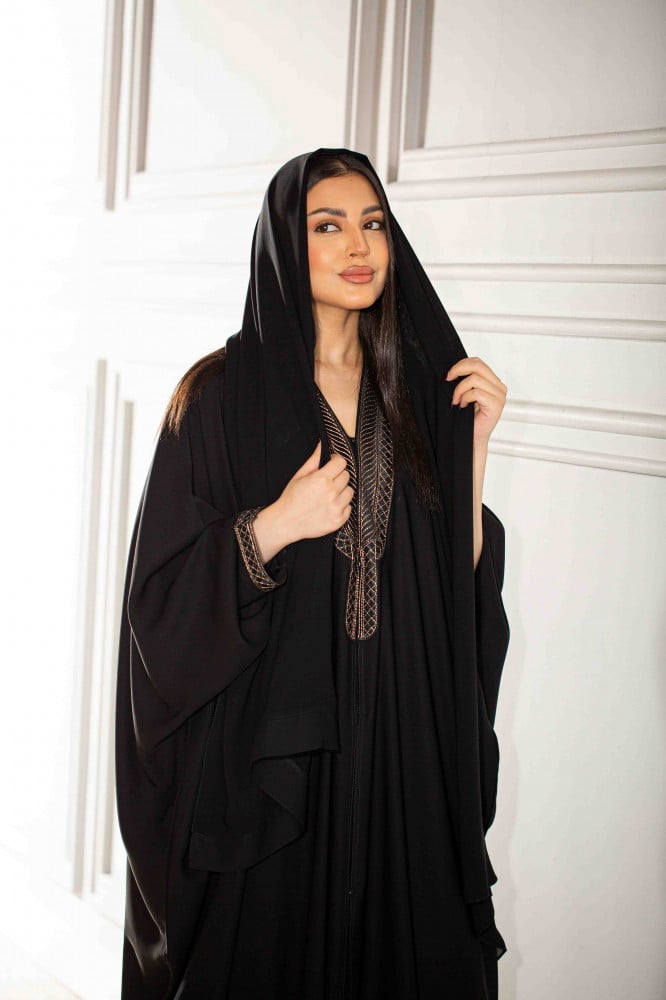 اخترنا لها خامة سوبر ندا من أفضل الخامات العملية، العباية صممت بتطريز معينات نحاسي بمقدمة ياقة الصدر وحول الاكمام، العباية مفتوحة وتغلق بطقطق، عرضها فري سايز لجميع المقاسات.