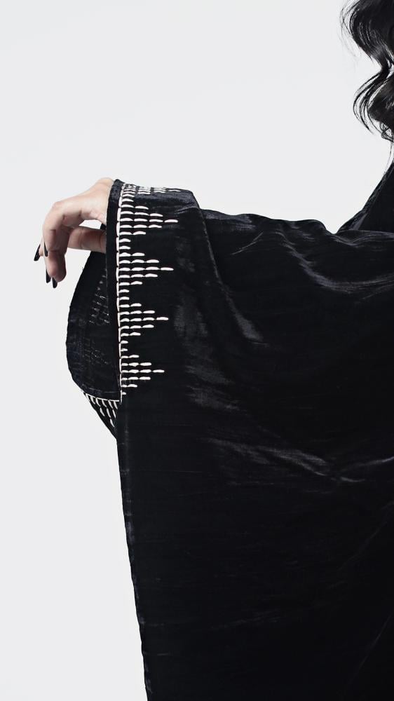 بخامة قطيف بلون اسود وبقصة بشت ومع تطريز بلون أبيض على الاكمام