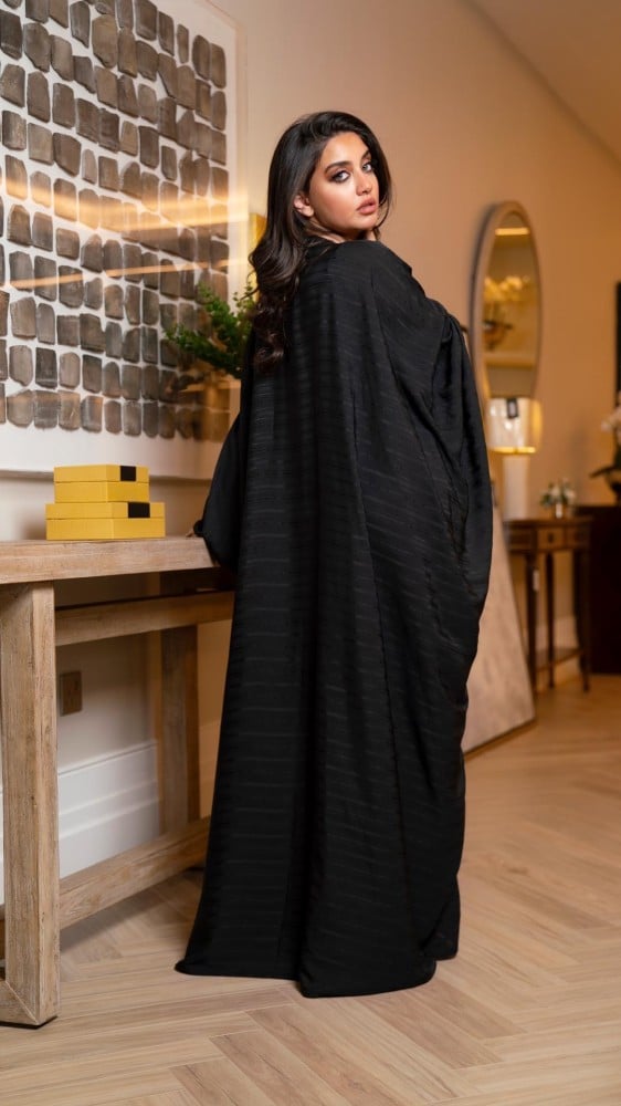 عباية بشت مقلمة من نفس الخامة بصميم عصري مختلف يضفي على طلتك مزيد من الرقي و الأناقة، معها طرحة سوداء مجانا.