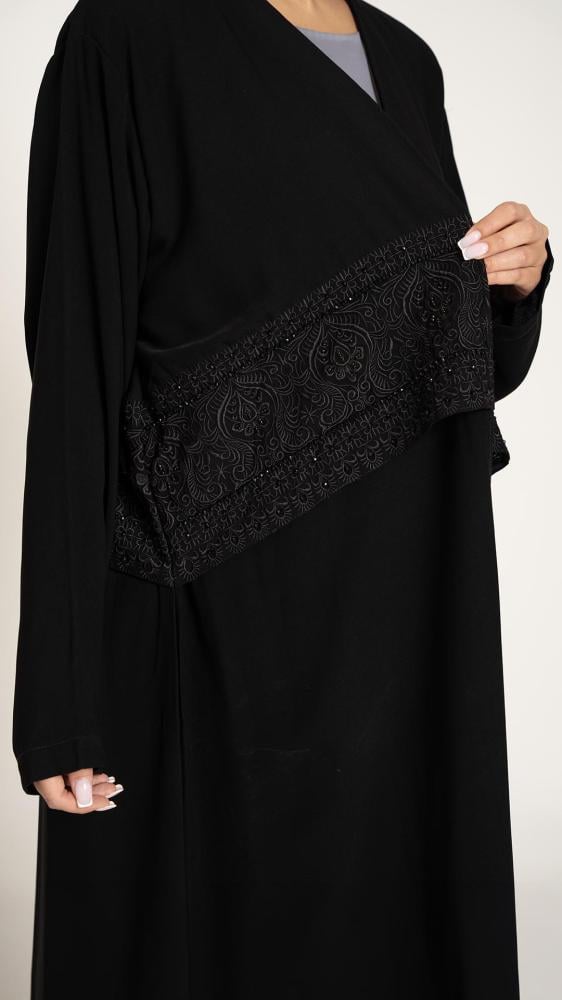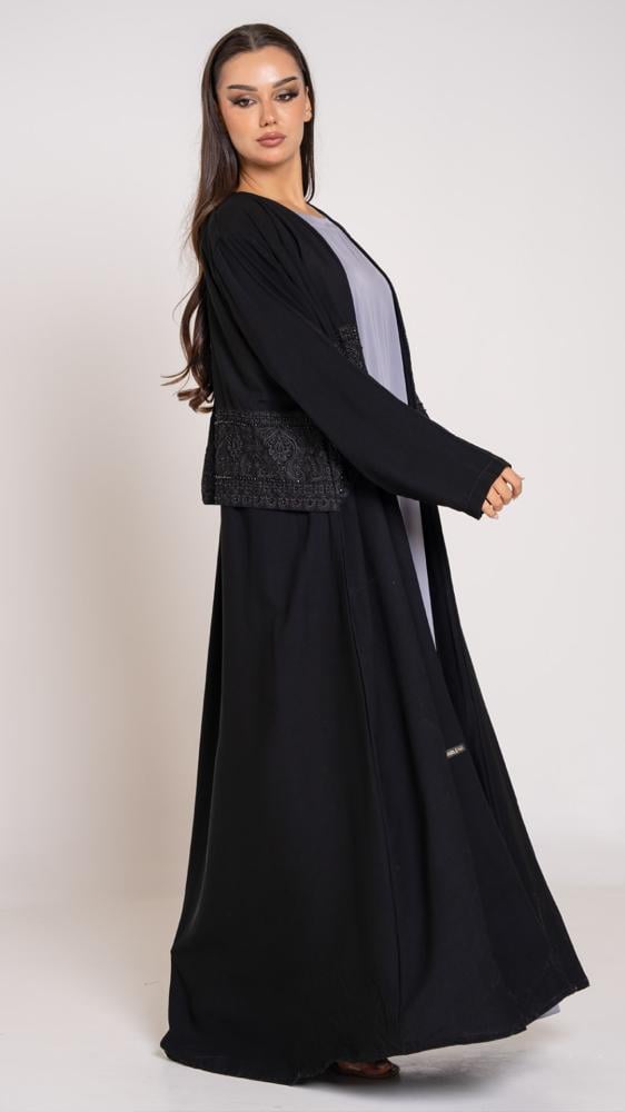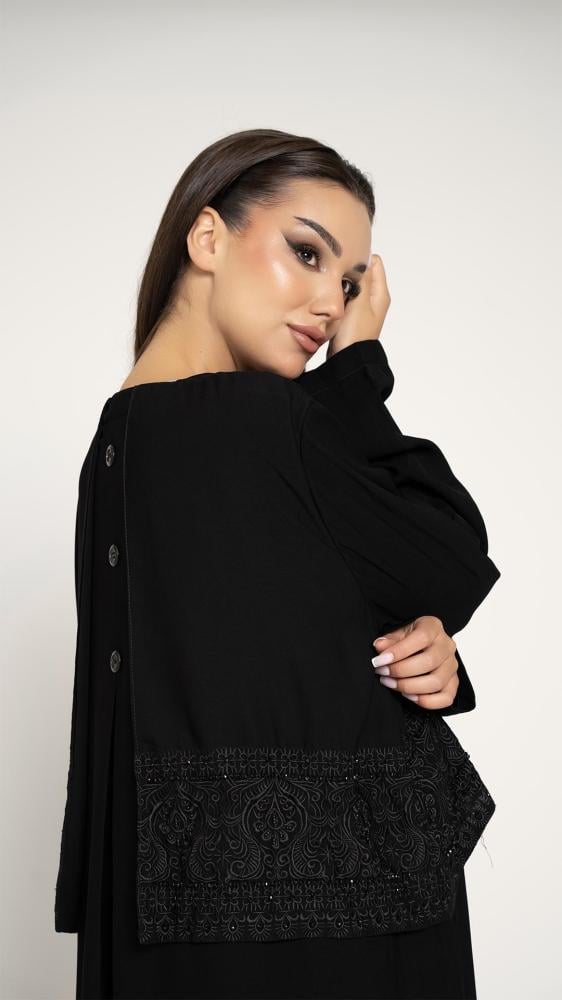 مصممة بقصة جاكيت شك وبقصة مفتوحة من الخلف ومزينة بأزرة العباية مفتوحة