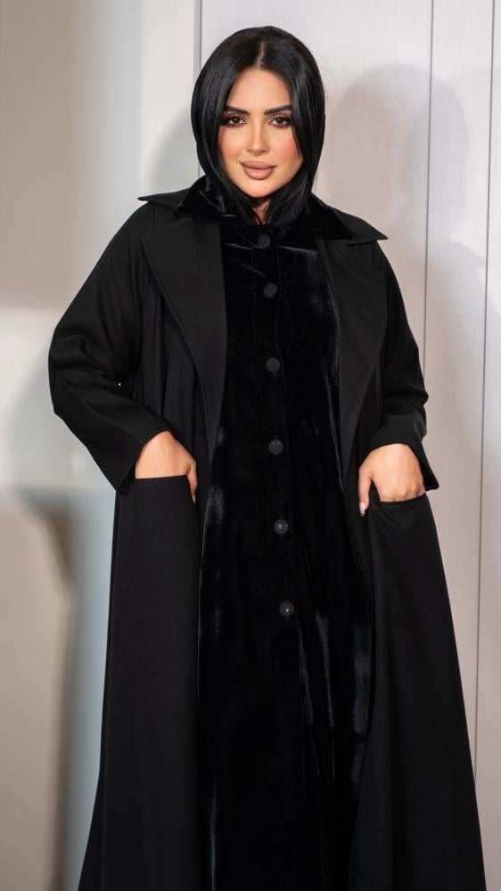 عباية سوداء بقصة بليزر وبفستان مشبوك فيها