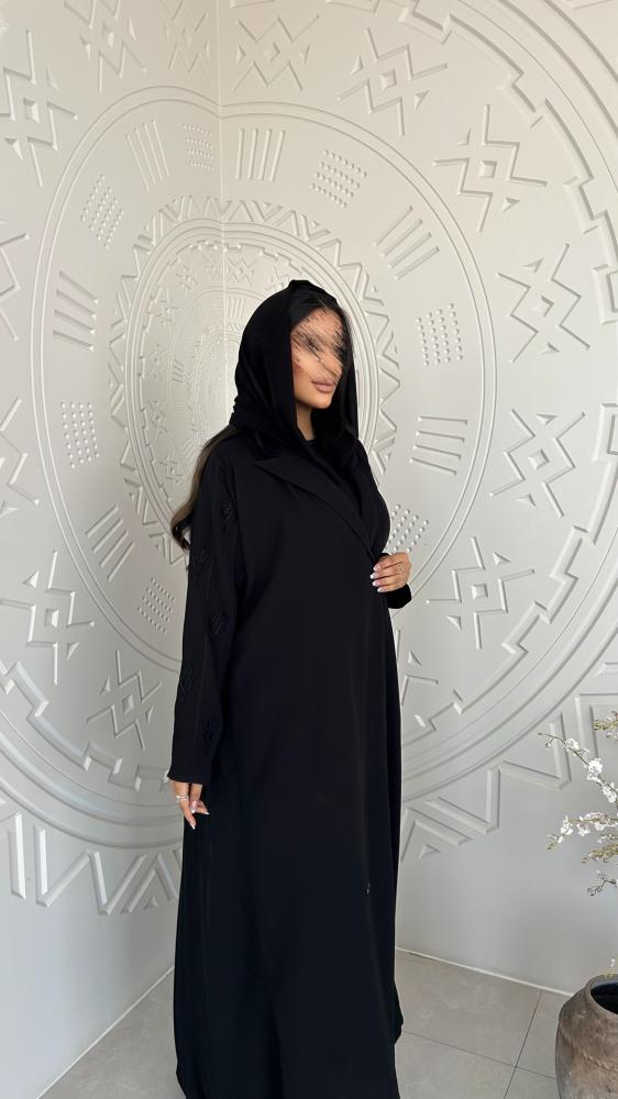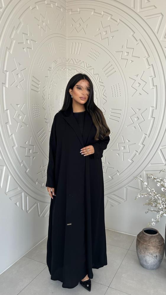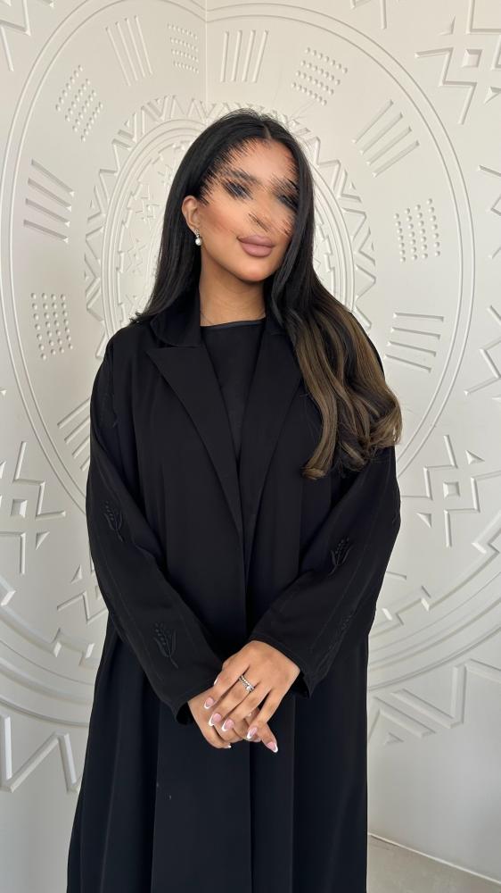 تفاصيل العباية مدروسة لأنها بقصة بليزر وقصة البليزر تحتاج دقة من الداخل للخارج اخترنا الاكمام تكون بتطريز اسود غير ملفت