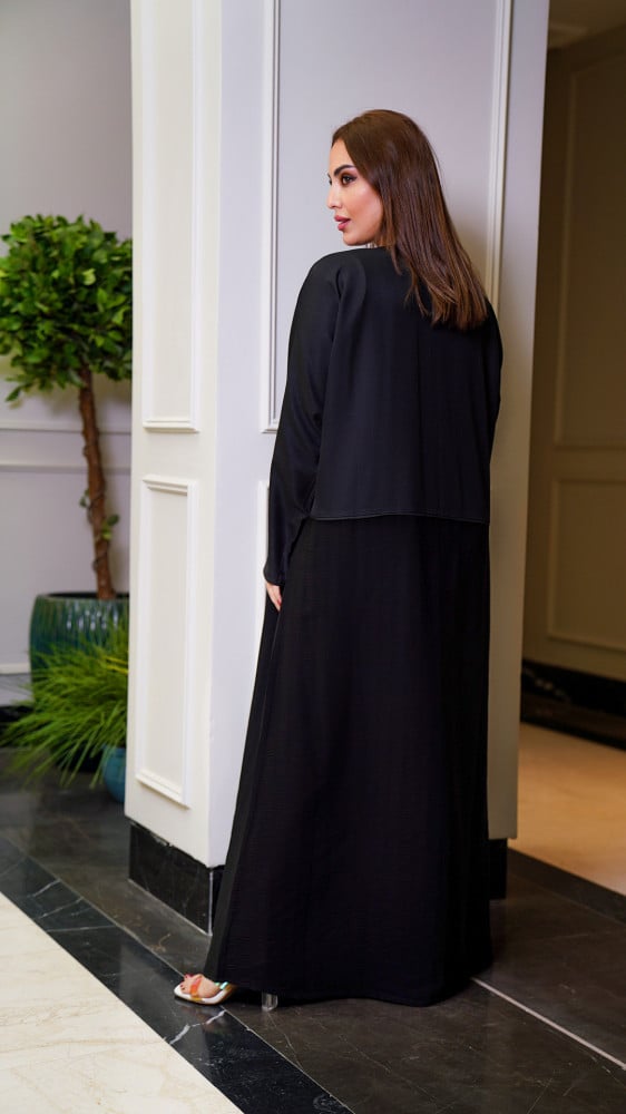 العباية صممت بلون اسود بخامتين مختلفة من الاعلى خامة كتان بلون اسود قاتم ومن الاسفل خامة كتان مقلم بدرجة لون اسود افتح من الاعلى، العباية مفتوحة بالكامل.