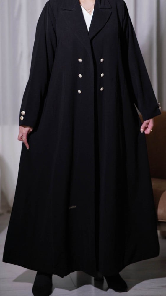 صممت رسمية وعملية بقصة ياقه رسمية وجيوب مزينه بأزره فخمة بلون ذهبي من الامام وعلى الاكمام العباية مبطنه بالكامل، اخترنا لها خامة تيجان من افضل الخامات العملية والمريحة للأستخدام اليومي.