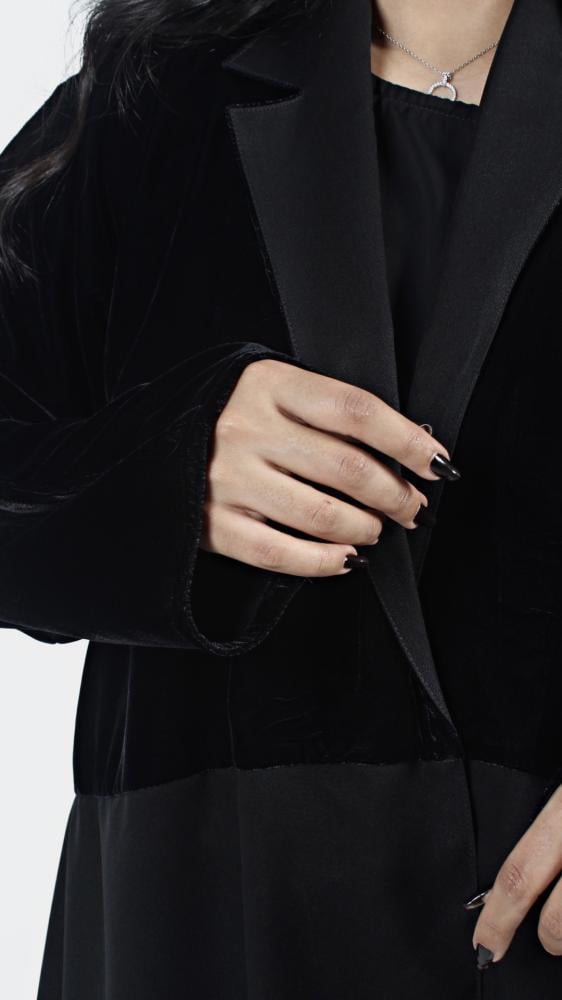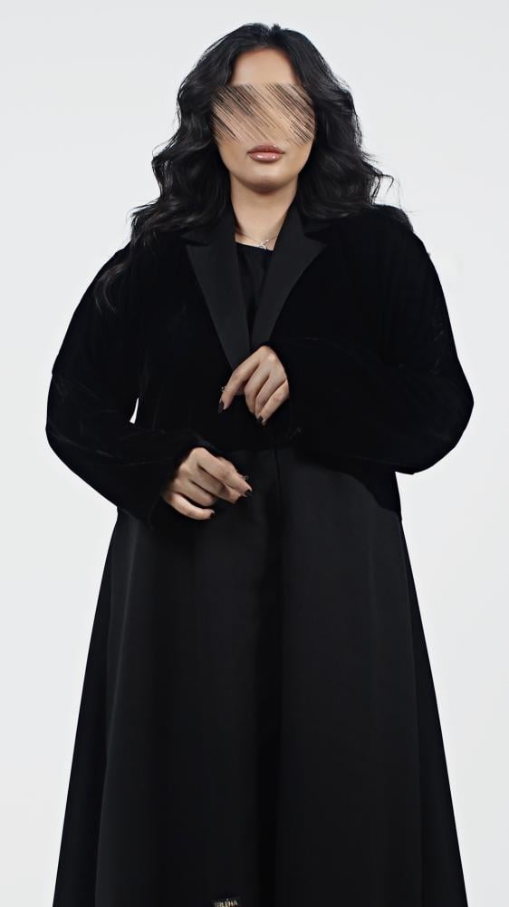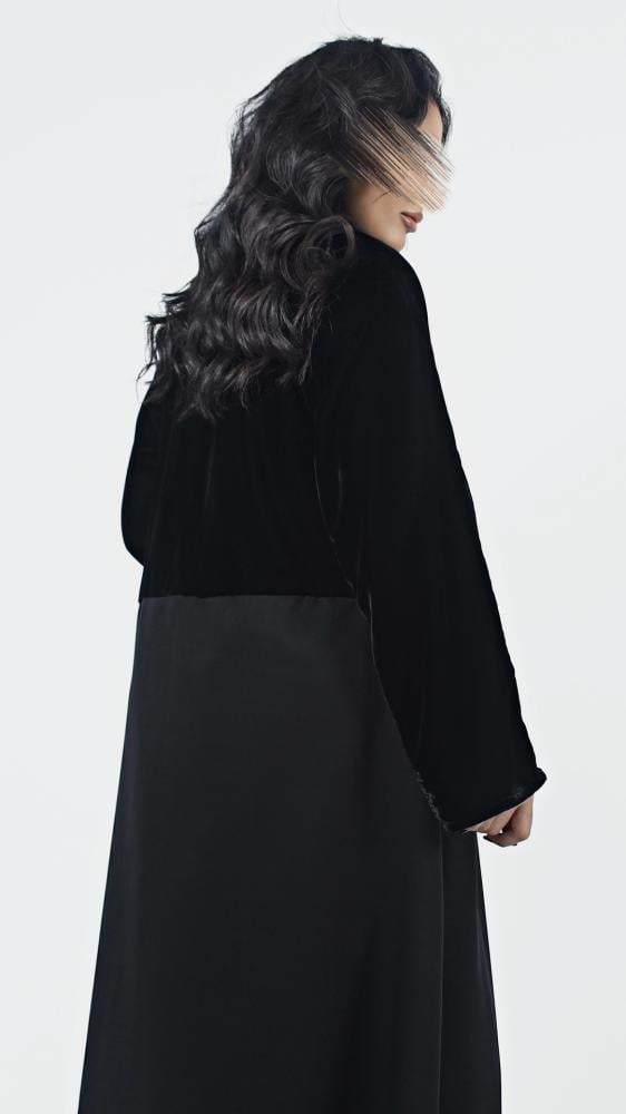 بطريقة ناعمة و دمجنا خامتين مع بعض من الأعلى مخمل ومن الأسفل سادة والنتيجة عباية شتوية وبنفس الوقت ماتثقل عليك
