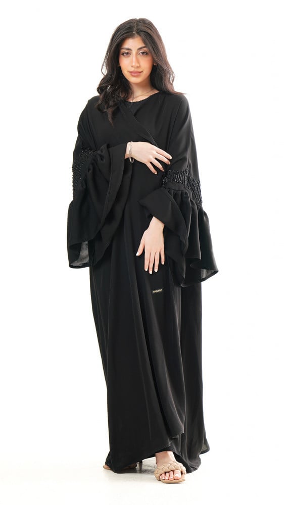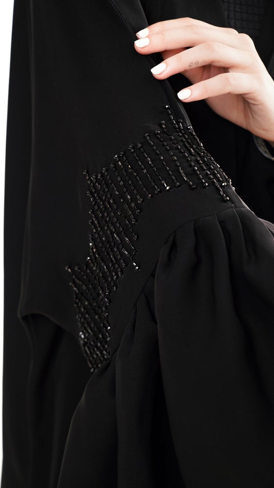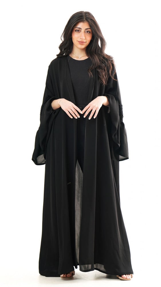 العباية بتصميم مميز وغير تقليدي سوداء مفتوحة، نسجت من خامة الأنترنت عالي الجودة، والأكمام صممت بقصة كلوش وكسرات ناعمة من منتصف اليد.