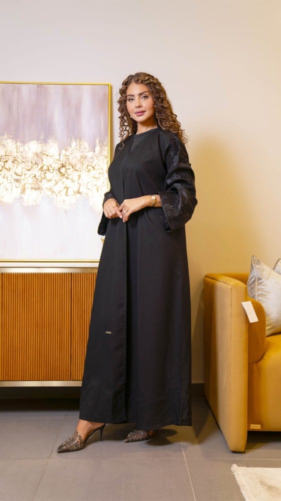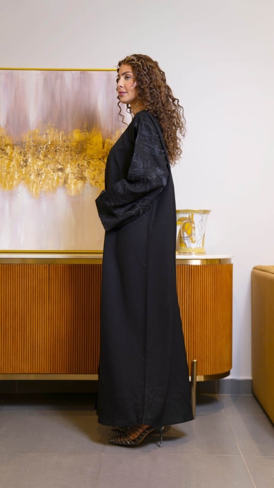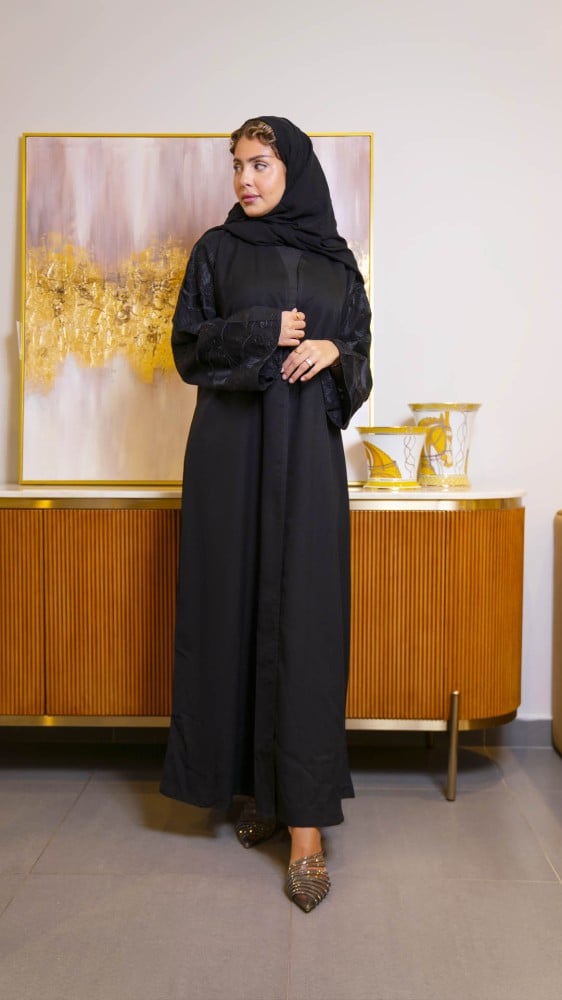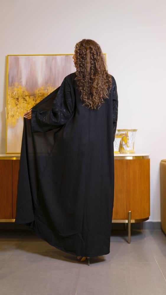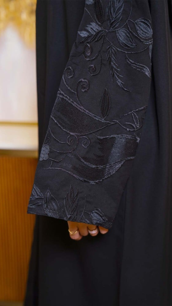 العباية بتطريز اسود على الاكمام بالكامل، اخترنا لها خامة ( ميني مت) من افضل الخامات العملية للبس اليومي، تم تصميمها مفتوحة لسهولة الحركة أثناء المشي.