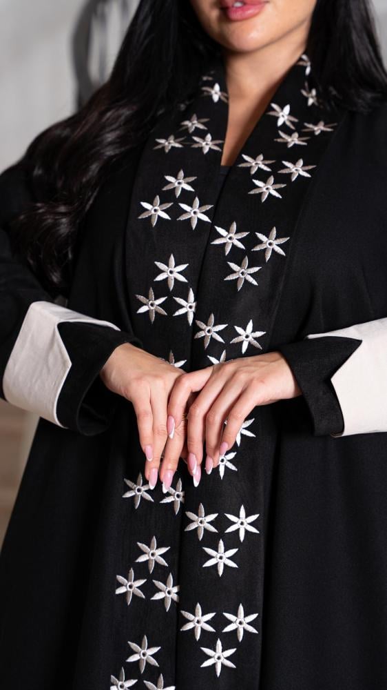 الأسود المطفي بأغمق درجاتة مع تطريز الورد بلون فاتح