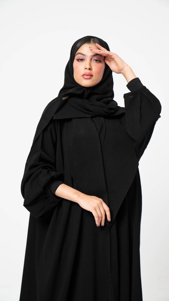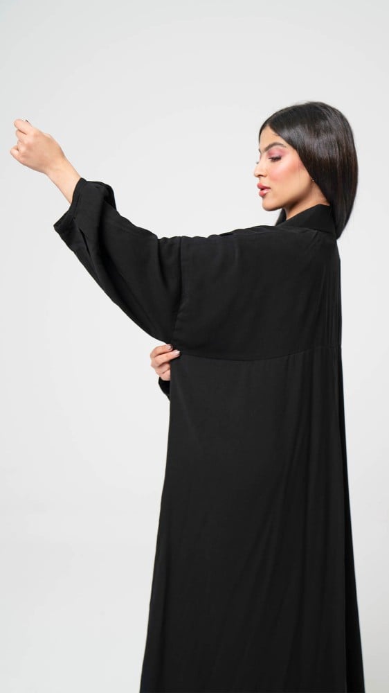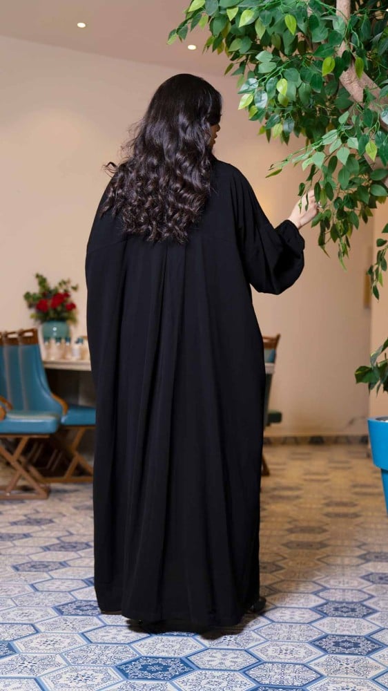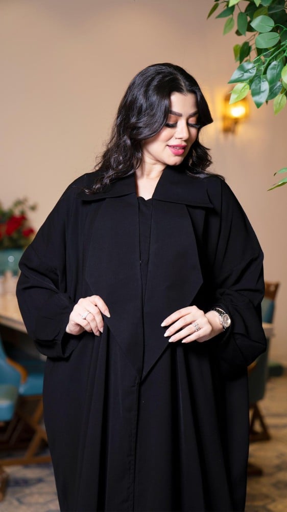 عباية سوداء بياقة عريضة وبقصة واسعة ساترة صممناها بقصة مريحة باللبس و فضفاضه مالك غنى عنها لأنها بِـ سواد تحبينه اخترنا لها خامة ( كريب ملكي) من افضل الخامات بسواد فاحم عملي تتحمل غسيل ولبس يومي