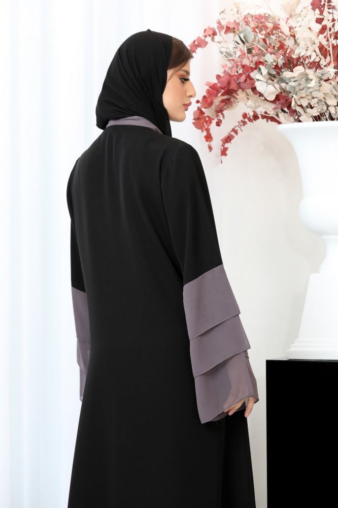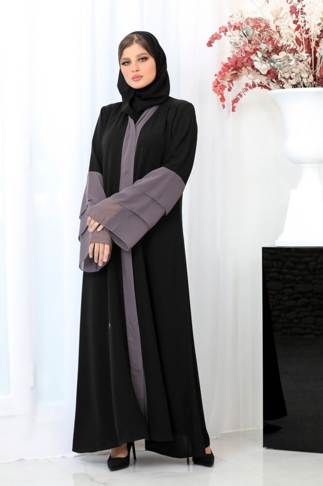 عباية أنيقة من قماش الانترنت عالي الجودة، زين الصدر بالطول بالشيفون وكذلك الأكمام بثلاث طبقات من الشيفون رمادي، العباية تقفل بالكامل بطقطق أسود.