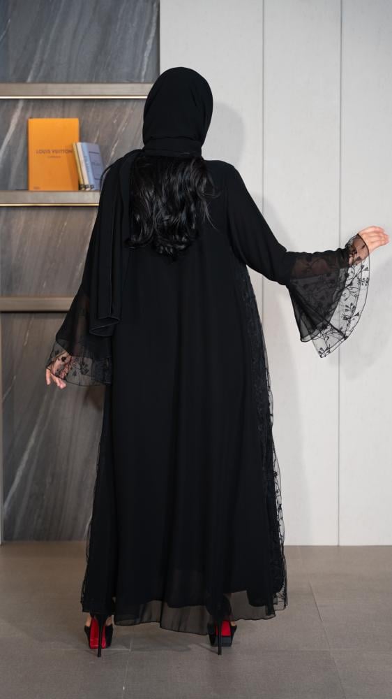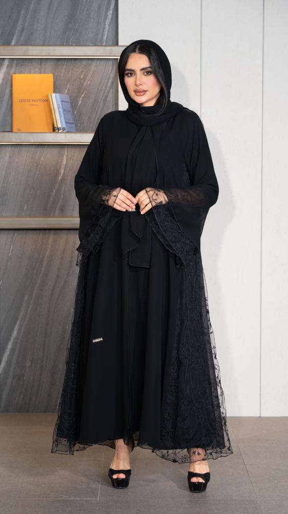 عباية باردة بخامة شيفون مبطنة وبِـ تُل على الجوانب من الاسفل والاكمام