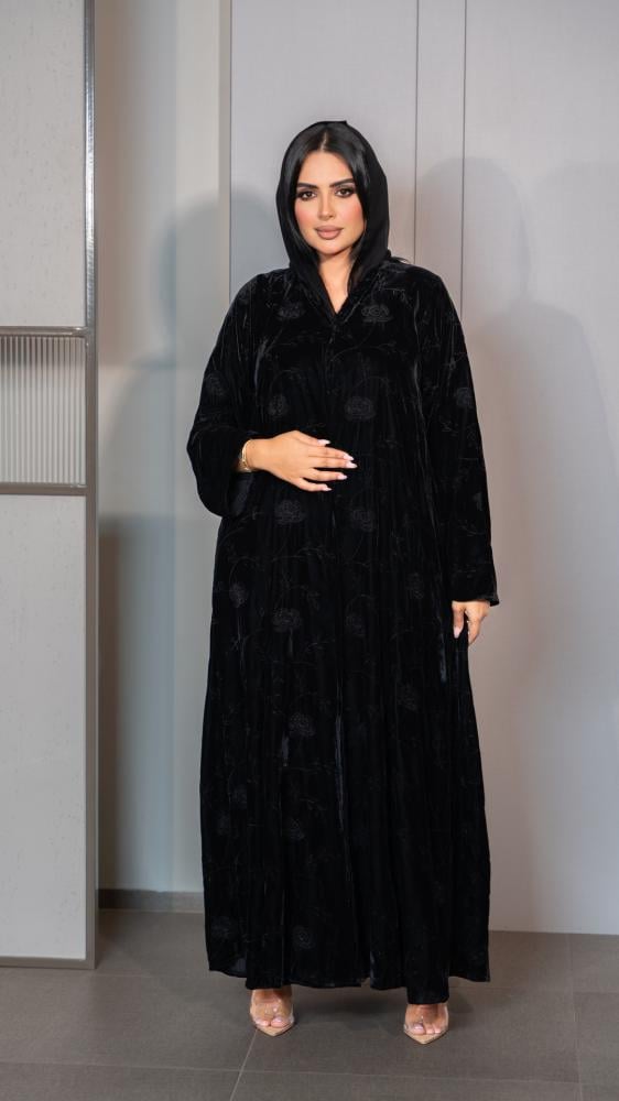 عباية شتوية صممناها بتطريز ورد دقيق وناعم وبخامة مخمل تدفيك