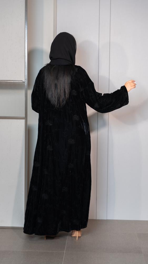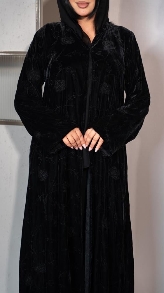 بخامة مخمل بلون اسود وبتطريز ورد على كامل العباية