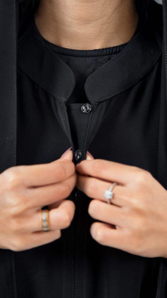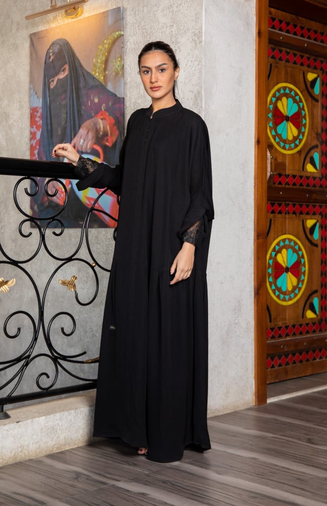 العباية مغلقه بلون اسود ما يتغير ولا يتأثر بكثرة الغسيل، من خامة انترنت عالي الجودة وصممت بكسرات ناعمة من الاسفل وباكمام دانتيل يمكن صفط الكم ليظهر الدانتيل او تركة مفرودا.