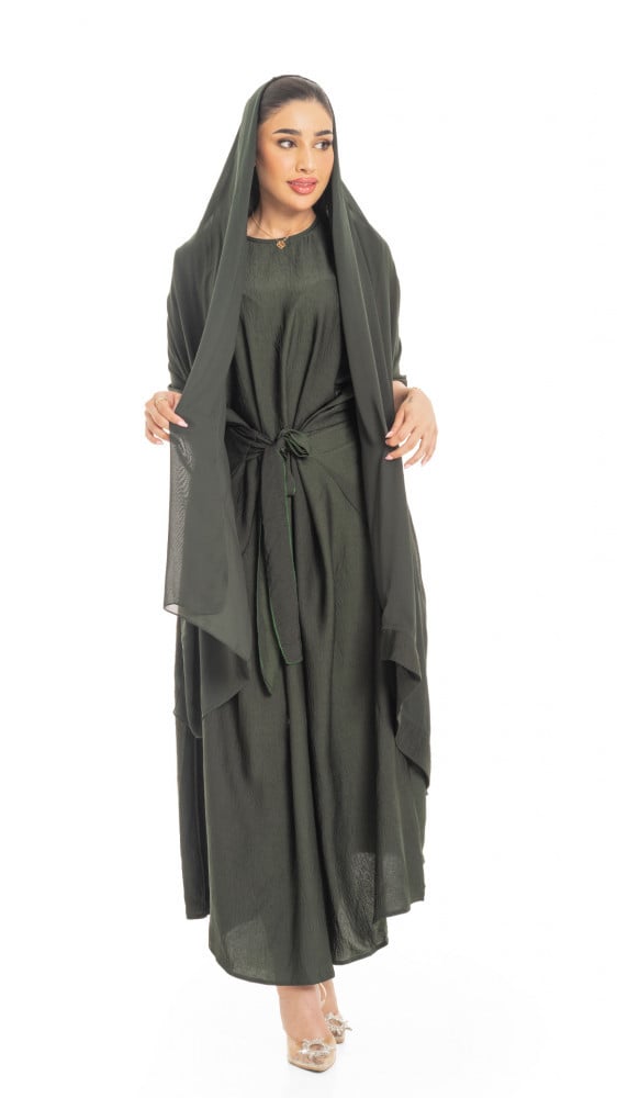 فستان عباية زيتي عملي وبخامة مريحة يلبس مع العباية ويمكنك تنسيقه مع مختلف القطع الأخرى.اطلبيه وانتي متطمنة لأنه: