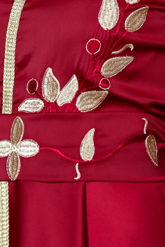 نسج من خامة تفتا سترتش بلون عنابي مطفي، تم تصميمه بقصة صدر مربعه ومطرزه بخيوط الحرير بلونين الاحمر والذهبي بحزام من نفس الخامه والتطريز، ومنتصف الفستان شريط من خيوط الحرير الذهبي وعلى احرف الاكمام نفس الشريط.